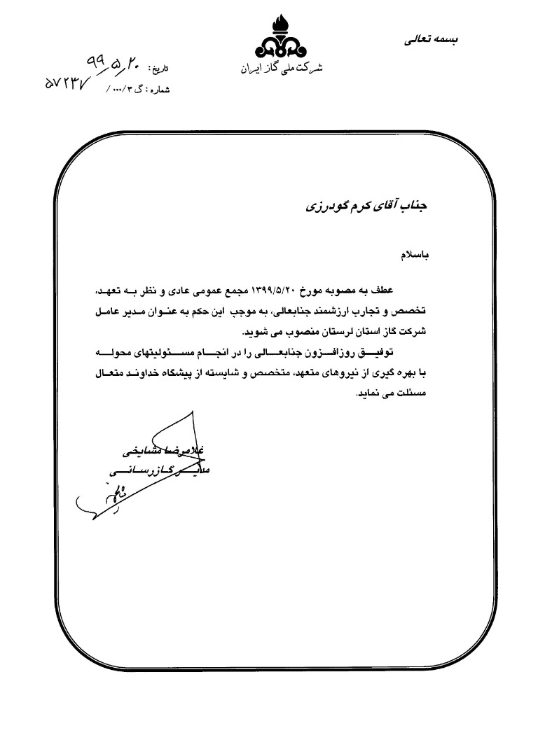 کرم گودرزی - شرکت گاز لرستان - انتصاب مقامات - غلامرضا مشایخیمقاله