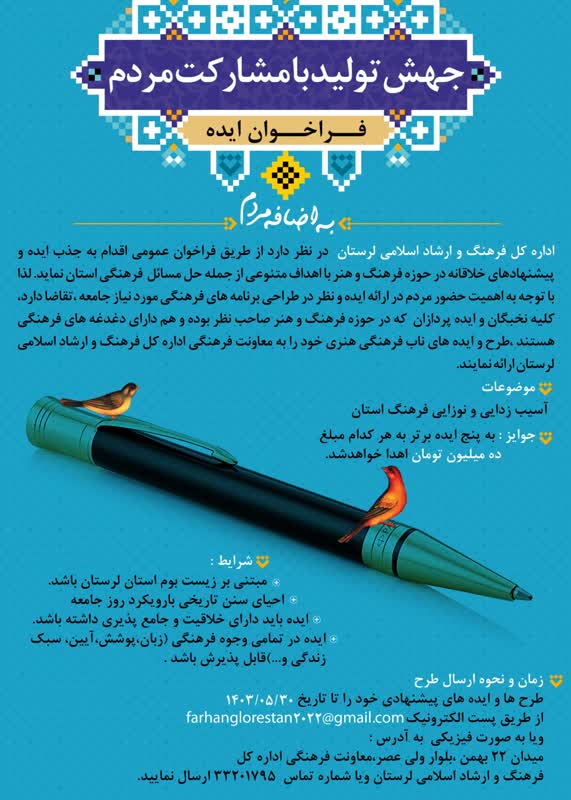 وی با بیان اینکه مشارکت مردمی رکن اساسی تحقق اهداف فرهنگی است، افزود: بر این اساس و با توجه به نامگذاری سال جهش تولید با مشارکت مردم، همهٔ نخبگان و ایده پردازانی که در حوزه فرهنگ و هنر صاحب نظر هستند و دغدغههای فرهنگی دارند طرح و ایدههای ناب فرهنگی هنری خود را به اداره کل فرهنگ و ارشاد اسلامی لرستان ارائه دهند.