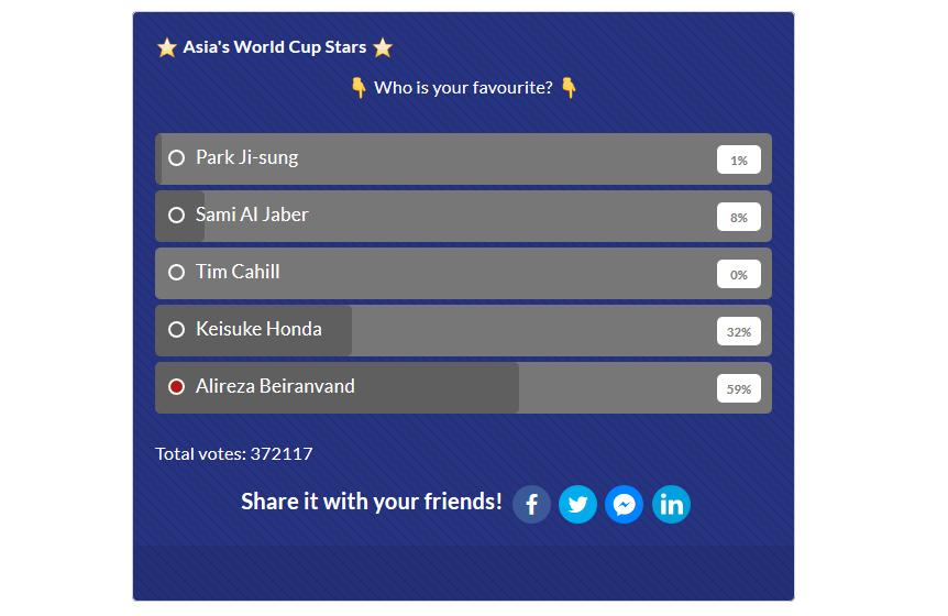 به گزارش پایگاه خبری زرک، سایت کنفدراسیون فوتبال آسیا در تازهترین نظرسنجی خود از کاربران خواسته بود تا بهترین آسیایی تاریخ جامهای جهانی را انتخاب کنند. در این نظرسنجی علیرضا بیرانوند، دروازهبان تیم ملی فوتبال ایران و پرسپولیس با ۵۹ درصد با اختلاف در رده نخست قرار دارد.