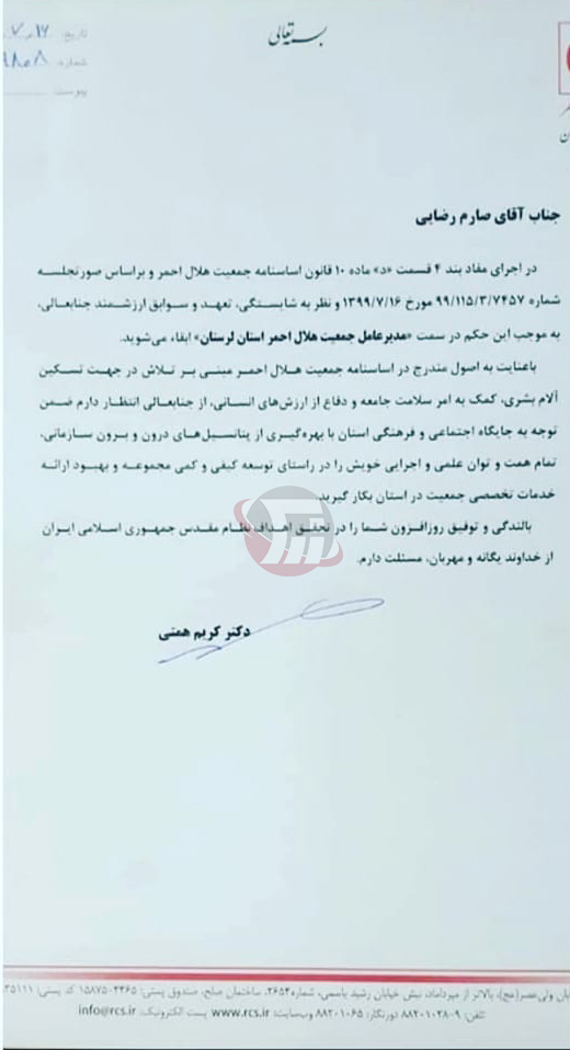 طی حکمی «صارم رضایی» مدیرعامل هلال احمر لرستان در سمت خود ابقا شد.