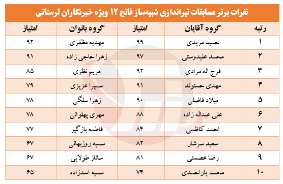 خبرنگاران برتر مسابقات تیراندازی شبیهساز فاتح ۱۲ در ۲ گروه آقایان و بانوان معرفی شدند.
