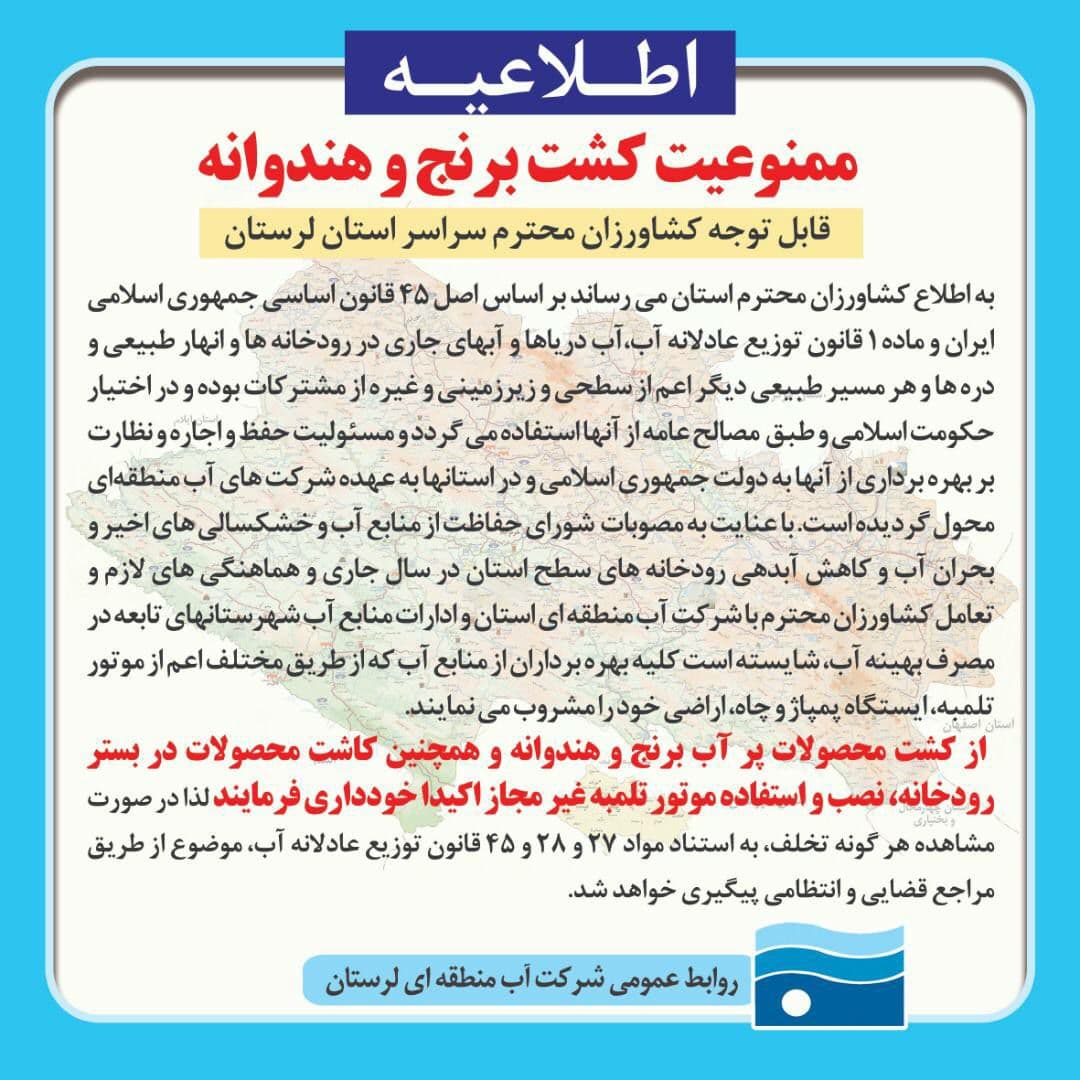 مدیرعامل شرکت آب منطقهای لرستان گفت: از کشت محصولات پر آب برنج و هندوانه و همچنین کاشت محصولات در بستر رودخانه، نصب و استفاده از موتور تلمبه غیر مجاز خودداری کنند.